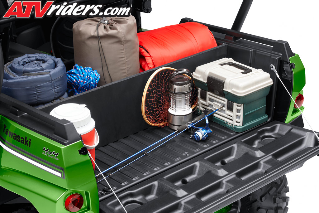 The heavy metal cargo bed was replaced with an lightweight yet durable 28” x 43” tilting cargo bed made out of a special plastic like material called no brake polypropylene, which originally was designed for use in steering wheels due its shatterproof nature. We were very glad to see this change, because in the past the cargo bed was very heavy. On our Kawasaki Teryx 750 project build, one of the first things we replaced was the bed by using a Lonestar Bed Delete that shaved off a near 80 lbs! With the new composite bed it is now lighter weight and is rated at 600lbs cargo capacity; 100lbs more than the previous Kawasaki Teryx 750.